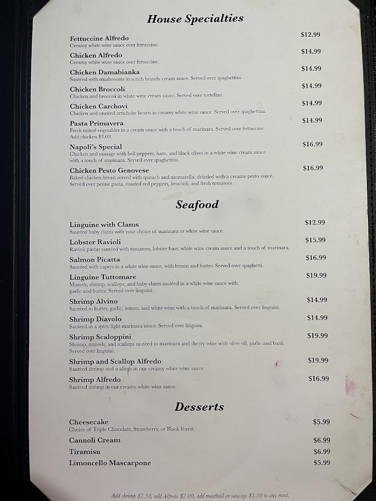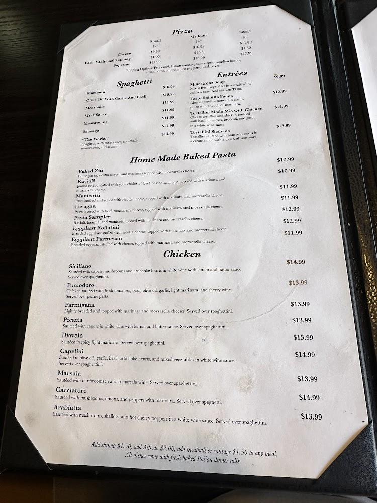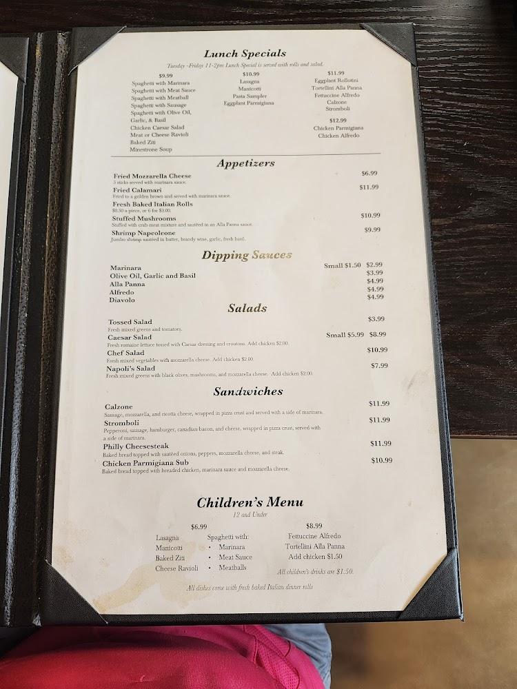 Lunch specials provide an affordable way to sample various items. Favorites include Tortellini Alla Panna and Eggplant Parmigiana. For those with children, a special menu keeps younger diners happy. Additionally, the dessert selection offers a sweet ending with treats like Tiramisu and Cannoli.