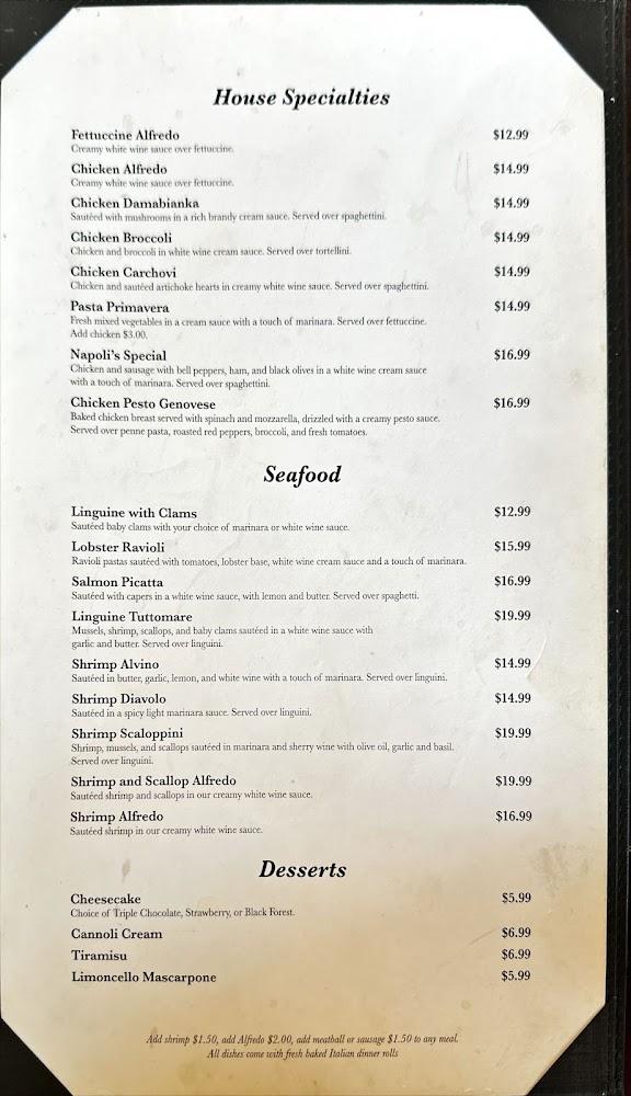 Napoli's menu boasts a wide range of Italian classics. Specialty items, like Chicken Pesto Genovese and Pappa al Pomodoro, explore different flavors. Each dish showcases a commitment to authentic recipes, ensuring a genuine taste of Italy.